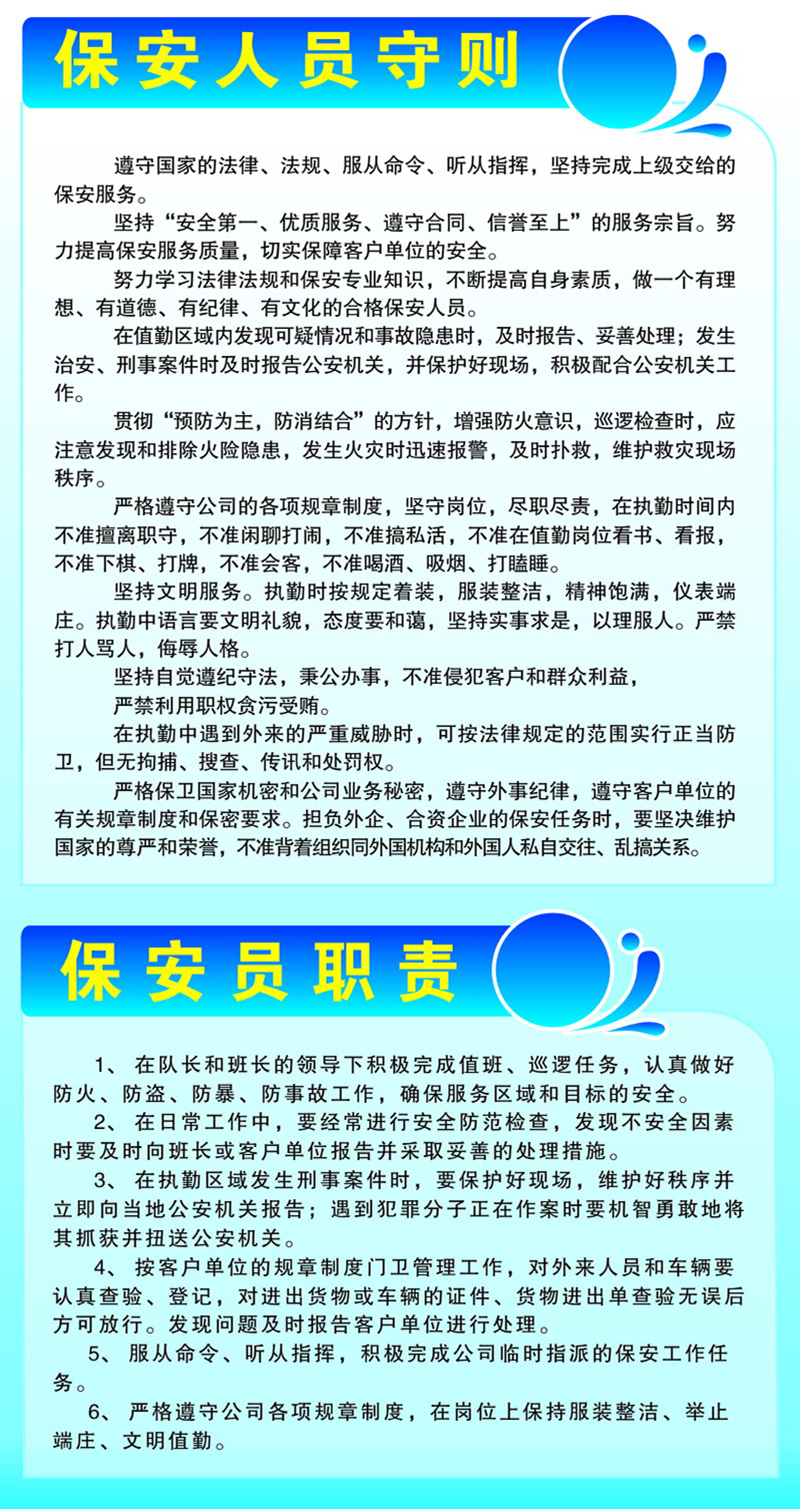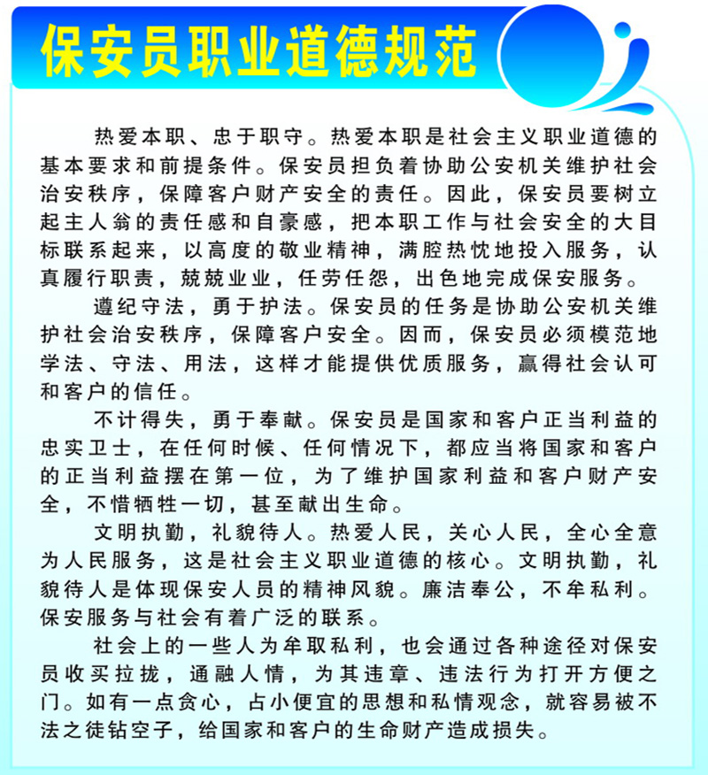 我公司成立于2010年9月,注冊(cè)資金550萬(wàn)元,服務(wù)范圍包括:門衛(wèi)、巡邏、非武裝押運(yùn)、守護(hù)、隨身護(hù)衛(wèi)、安全技術(shù)防范、區(qū)域秩序維護(hù)、保安器材銷售等。
